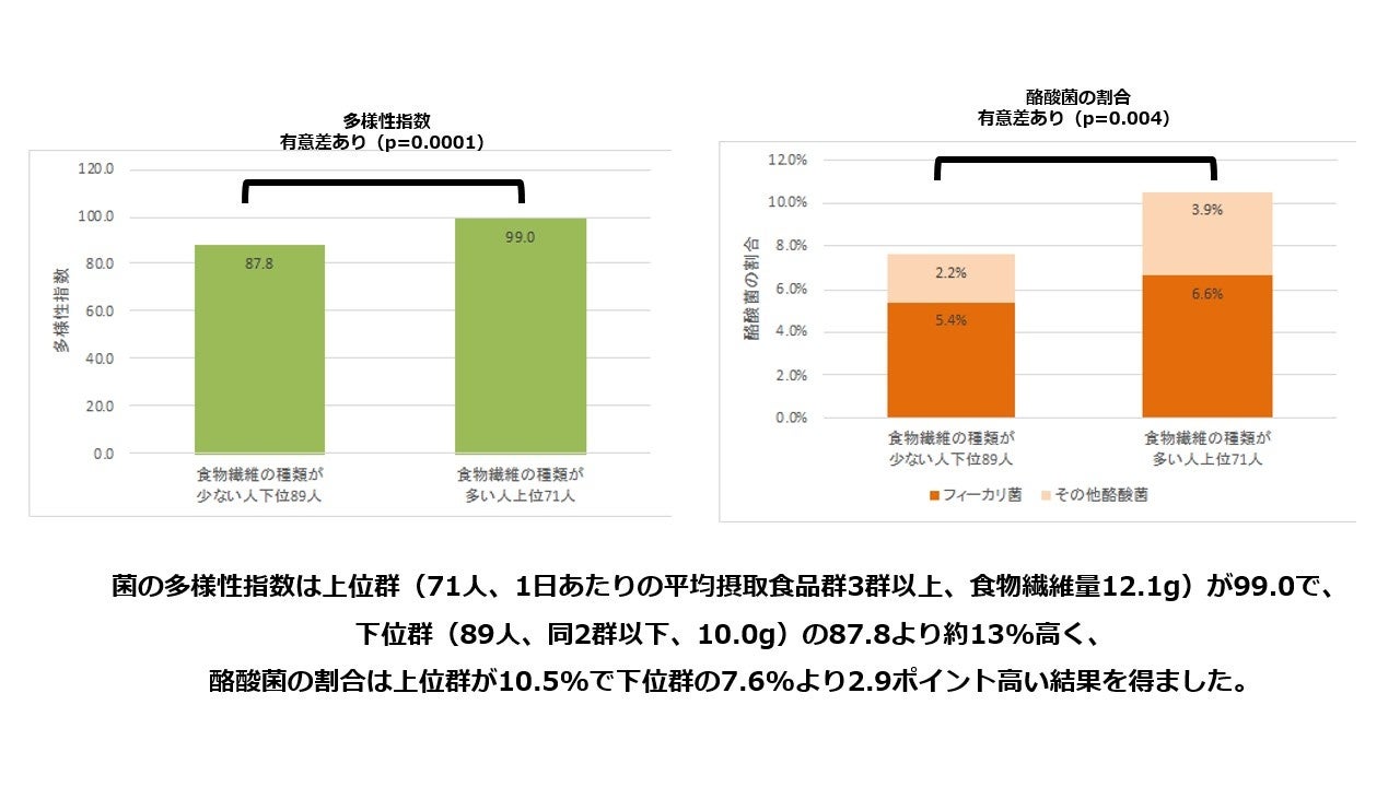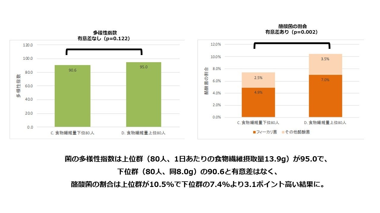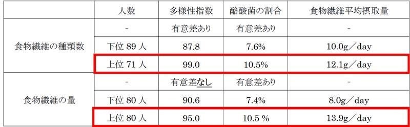 食物繊維の量を多く摂取している上位群と少ない下位群では、両者の「菌の多様性指数」に有意差が認められず、「酪酸菌の割合」のみ上位群に有意差が認められました。