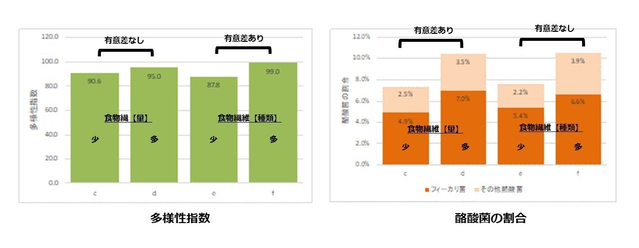 このように、食物繊維の「量」より「種類数」の方が、多様性指数と酪酸菌の割合の双方において有意差が認められました。