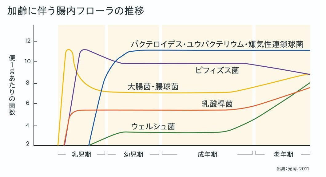 また、腸内環境を見てみると、乳児期(0歳〜1歳)の腸内細菌はビフィズス菌が多数を占めています。しかし、離乳後は食事や環境の変化により、大人と同じようなさまざまな種類やバランスの腸内細菌に変化していきます。乳児期の腸内細菌の多様性は低く、幼児期から大人になるにつれて高くなり、特に健康な大人ほど菌の多様性が高いとされていることから、この多様性を高めるための活動を、子どもの頃、特に腸内環境のベースが決まると言われている2歳〜6歳の間からしっかりと行うことが重要となります。