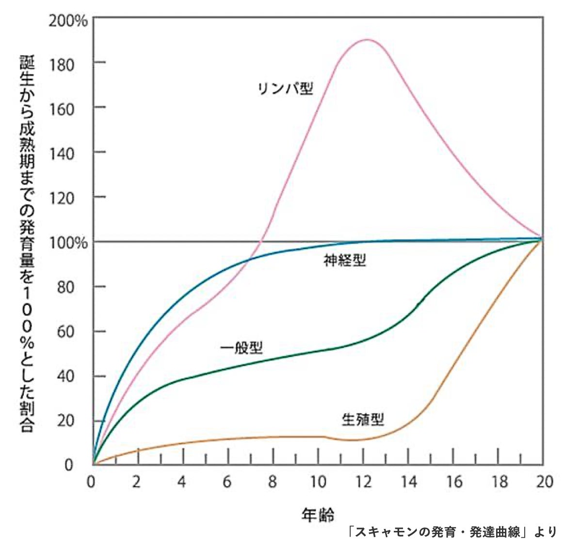 スキャモンの発育曲線では、免疫力を向上する機能を示すリンパ型は生まれて6歳頃までに成人の80%の成長を遂げるとされています。特に、脳神経回路を示す神経系は6歳頃までに成人の90%の成長を遂げるとされているとされているため、この時期は、神経系の発達が著しく、さまざまな神経回路が形成されていくことで、ゴールデンエイジとも呼ばれています。