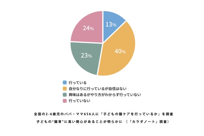 当社が業務提携している、妊婦や育児向けアプリ提供の(株)カラダノートのメルマガ会員656人(全国の2〜6歳児のパパ・ママ)を対象としたアンケート調査(2022.12)によると、約8割もの親が「子どもの腸ケア」に関心を持っていることが明らかになりました(子どもの腸ケアを「行っている」「自分なりに行っているが自信はない」「興味があるが行っていない」の合計)。ただ、実際の腸ケアの方法としては「ヨーグルトなどの発酵食品の摂取」という回答が、全体の約半数を占めていました。 こうした結果から当社は、「子どもの“腸育”は両親の関心が高いものの、その具体的な方法まではあまり浸透しておらず、偏った腸ケアになっているのでは」と考えています。