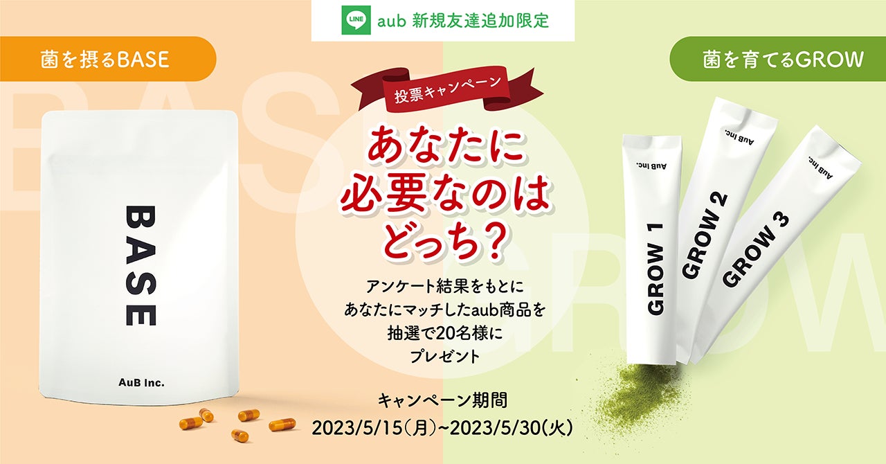 概要 : 新規でLINEお友達登録を行い、アンケートに回答した方の中から抽選で20名様にaubの腸ケア商品(aub BASE or aub GROW)をプレゼント