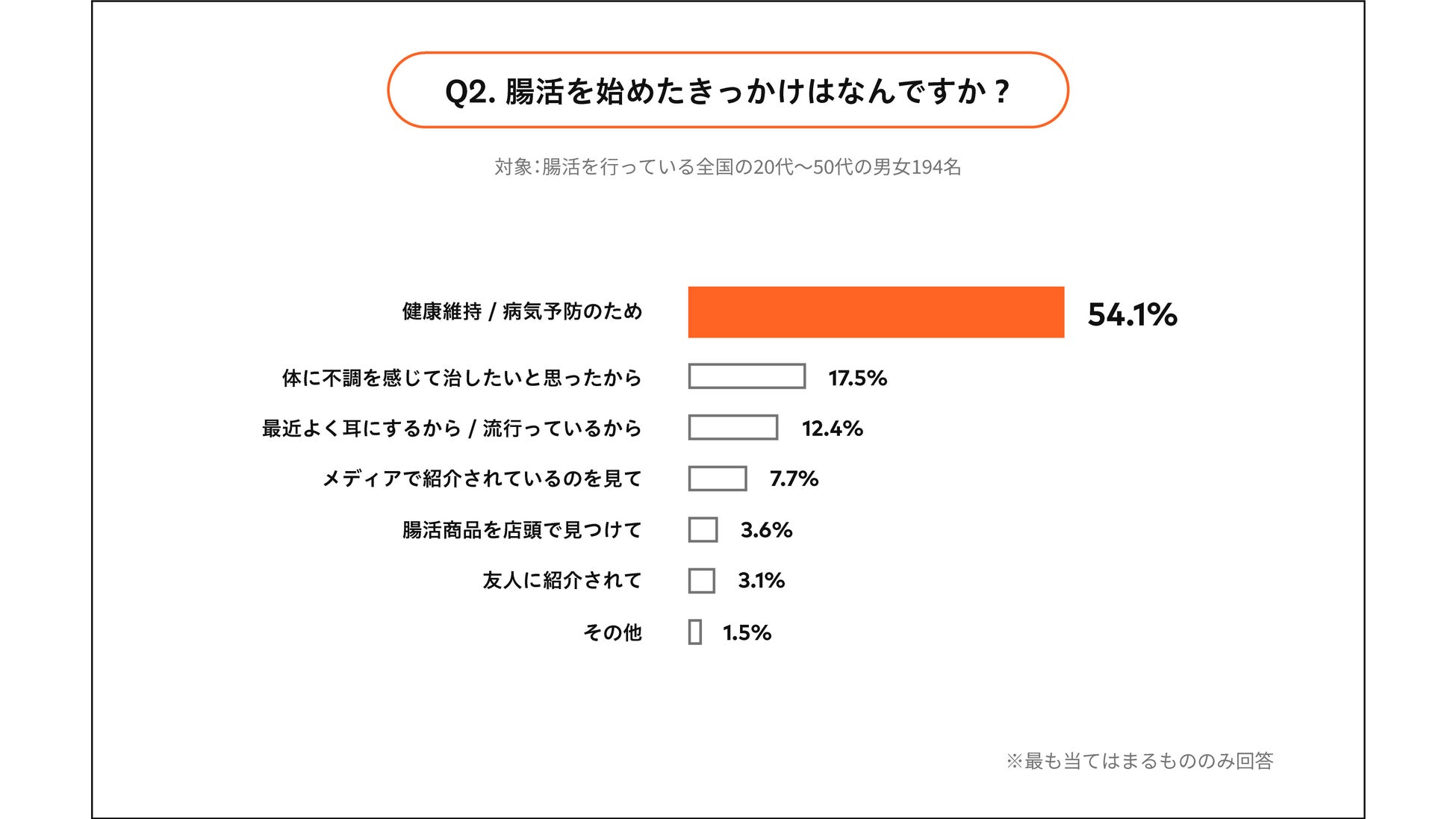 半数以上は「健康維持」や「病気予防」が腸活を始めたきっかけと回答し、「健康意識」の高まりが伺えます。次いで、「不調を感じて治したいと思ったから」という声が多い結果となりました。