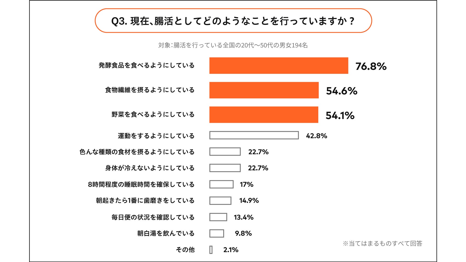 腸活を想起しやすい食べ物を取り入れることから、実践するという方が多い傾向にあります。