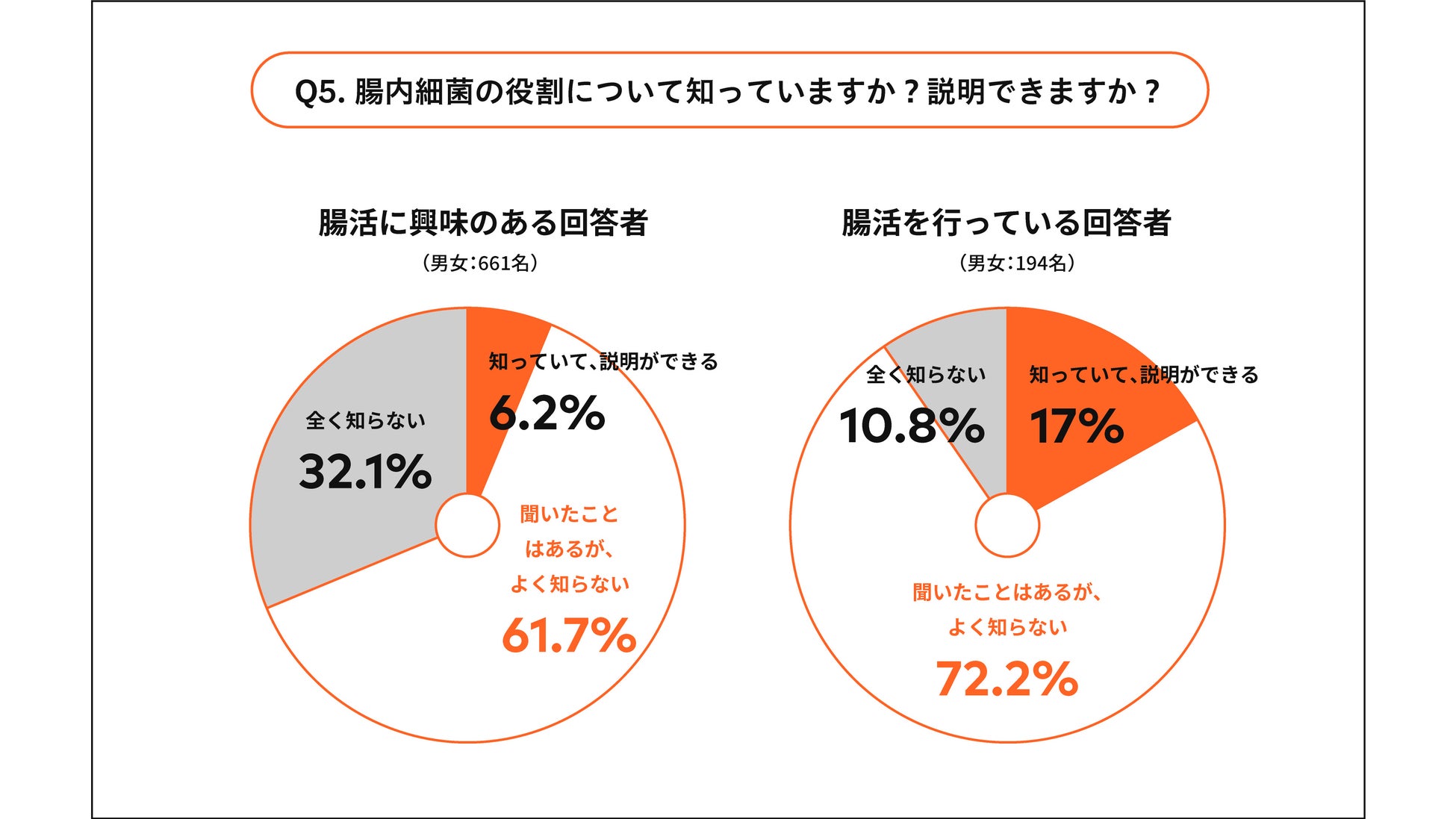 「腸活に興味がある」と回答した方のうち9割以上が腸内細菌の役割を理解していない結果となりました。また、「腸活を行っている」と回答した方の中でも83%が腸内細菌の役割を知らないまま、腸活を行っていることが判明しました。